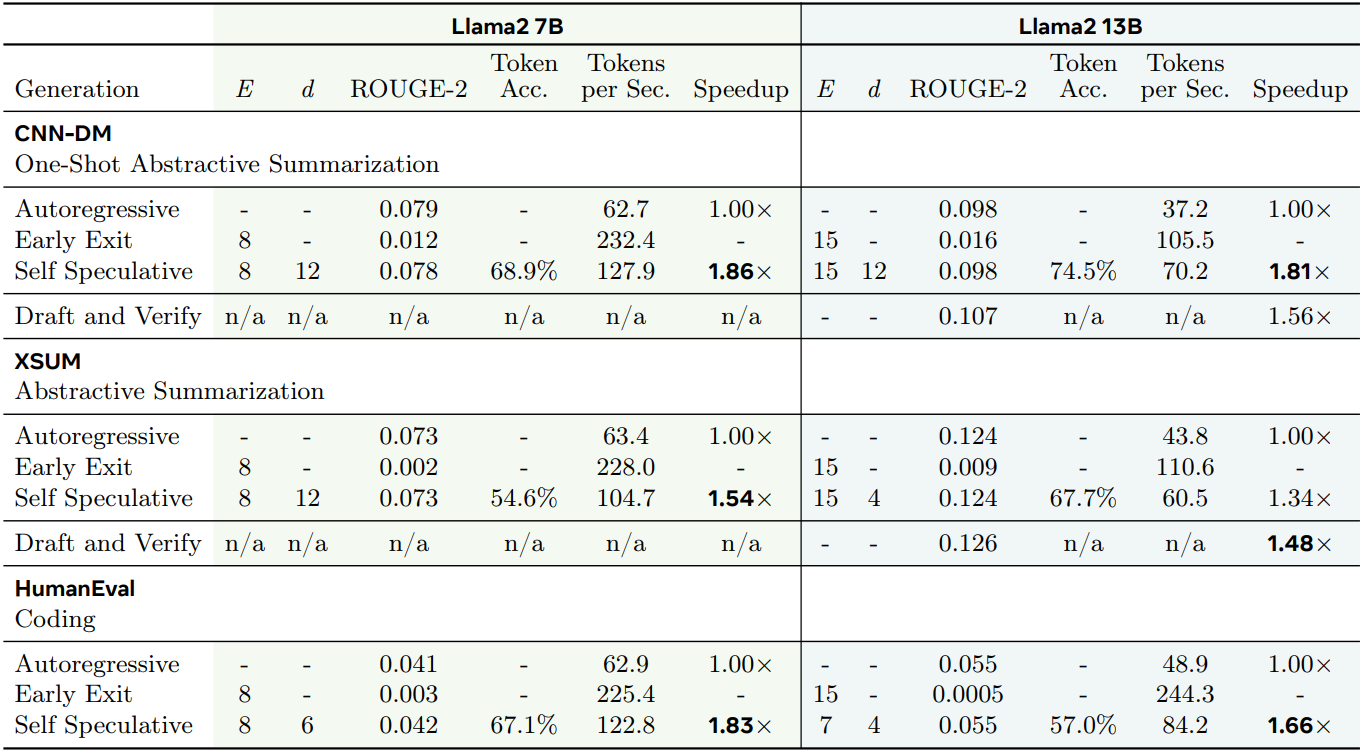 조기 종료로 토큰을 생성하고 나머지 레이어를 통해 병렬로 토큰을 확인하고 수정하는 self speculative decoding을 제안한다.