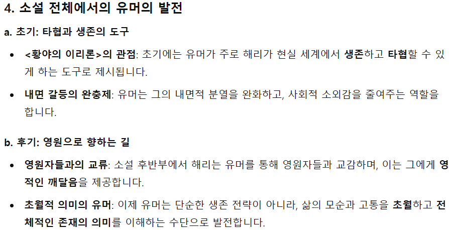 그런데, 작품 중간에 나오는 <황야의 이리론>이라는 글에서는 유머가 '영원으로 가기 위한 해결책'이 아니라, '현실과 타협하는 도구'라고 설명하고 있다.