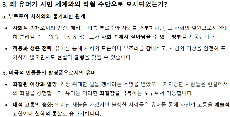 - 그런 사람들이 처한 문제의 해결책으로 (삶의 모순과 고통을 웃어넘길 줄 아는) '유머'를 제시한다.
