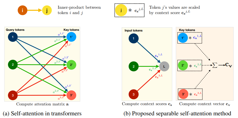 본 논문에서는 transforemr에서 MHA의 병목 현상을 해결하기 위한 O(k) 복잡성을 가진 separable self-attention이라는 새로운 방법을 소개한다. 효율적인 추론을 위해 제안된 self attention 방법은 MHSA에서 계산 비용이 많이 드는 연산을 요소별 연산으로 대체한다.